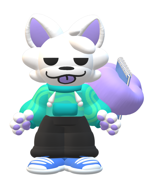 Quah is a silly with white fur, purple paws, tongue and tail. They wear a green/blue hoodie, black pants and blue shoes. They also have a blue/purple notebook stuck inside their tail. Quah will be the character the player controls in My silly game 2.